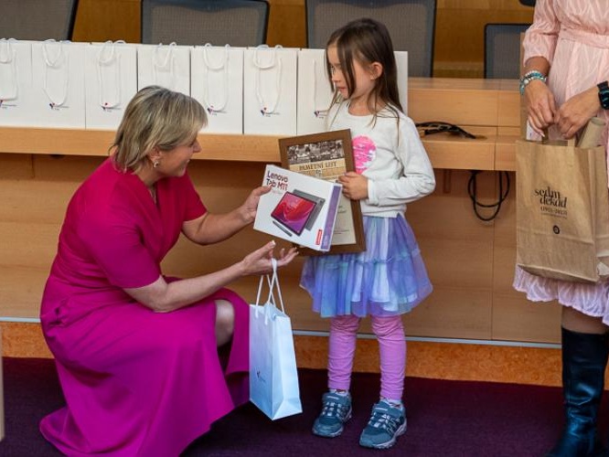 Karlovy Vary - V pondělí 29. září 2025 se v zastupitelském sále krajského úřadu rozdávaly ceny vítězům hejtmanské výtvarné soutěže na téma „Babičko, dědečku – ty jsi můj poklad“. Ta letos překonala všechny dosavadní rekordy. Celkem do ní děti přihlásily 468 prací. Autoři těch nejlepších si z rukou hejtmanky Karlovarského kraje Jany Mračkové Vildumetzové převzali hodnotné dary v podobě mobilních telefonů, tabletů, bezdrátových sluchátek a poukazů na výtvarný workshop. Udělena byla i zvláštní ocenění Galerie umění Karlovy Vary.