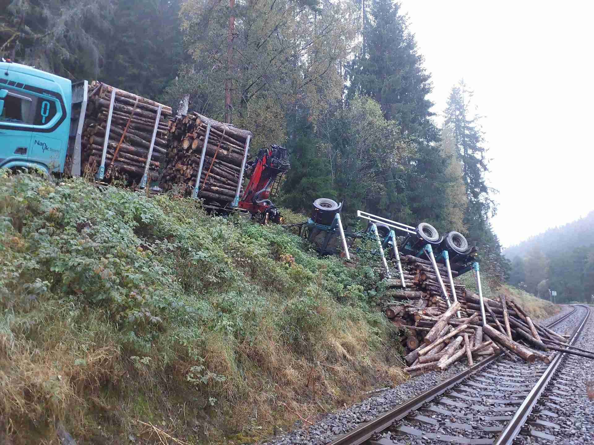 Podle prvotních informací je nákladní vůz převrácený a vysypané dřevo blokuje jak silnici, tak železniční trať. Doprava je v úseku zcela zastavena a předpokládaná doba uzavírky je až do 17:00.