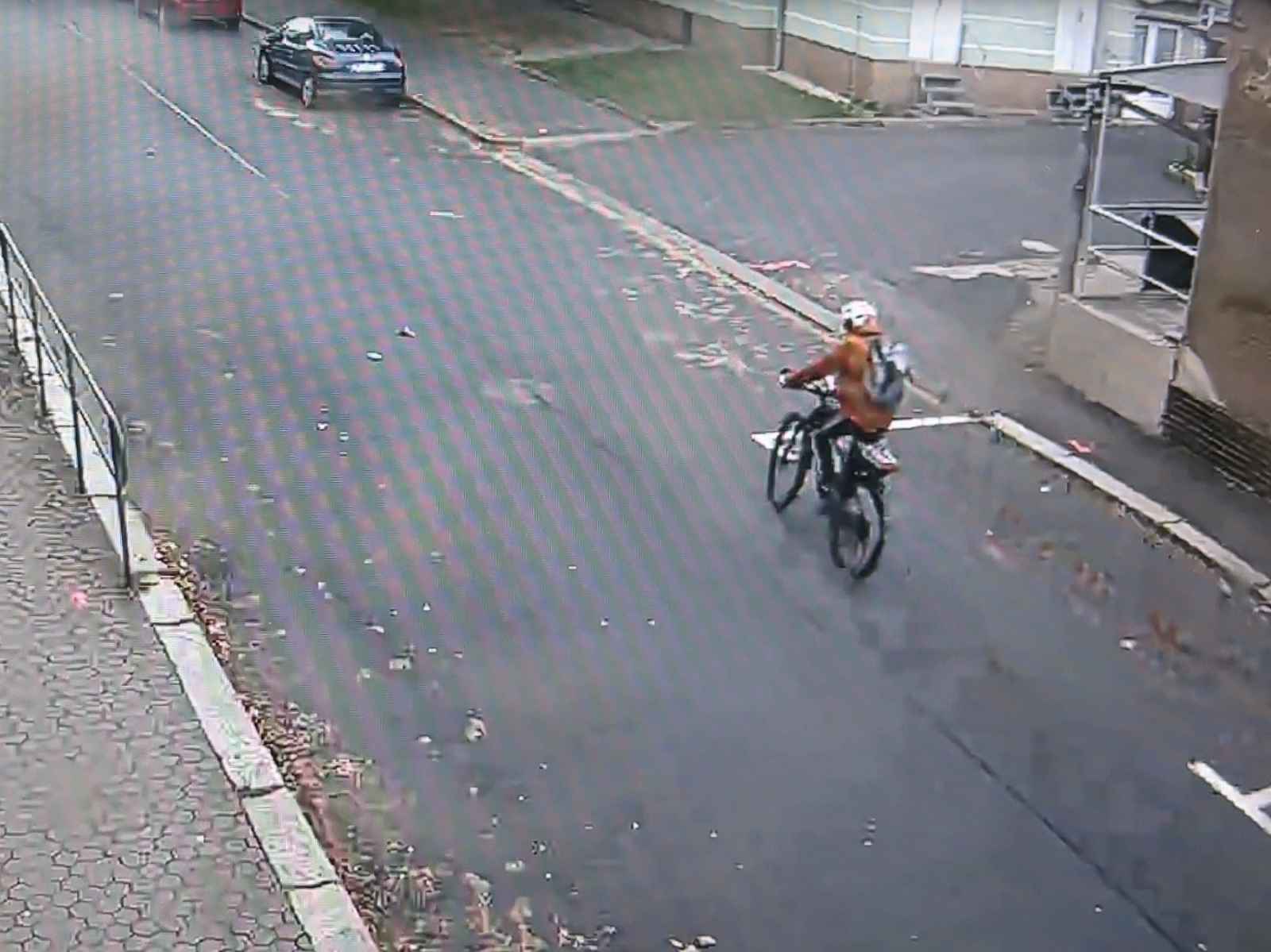 Cyklista měl na sobě tmavé tepláky po straně s bílým pruhem a hnědou bundu. Na zádech měl batoh ve světlých barvách. Na hlavě měl helmu bílé barvy.