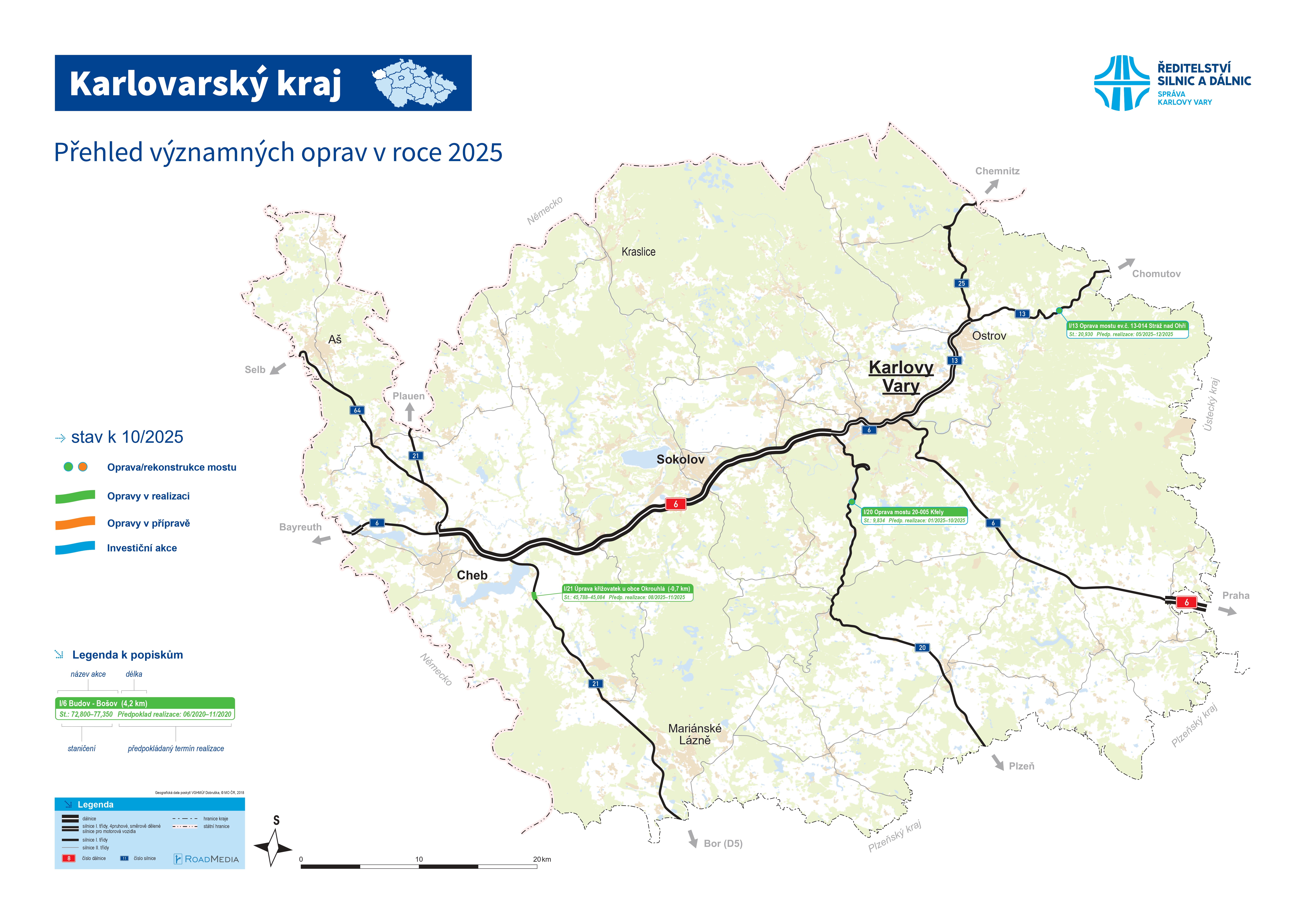 Karlovarský kraj – Ačkoliv stavební sezóna pomalu končí, na silnicích v Karlovarském kraji ruch neutichá. Řidiči se musí obrnit trpělivostí hned na dvou důležitých tazích – na silnici I/13 u Stráže nad Ohří a na silnici I/21 u Okrouhlé. V obou případech si práce vyžádaly kyvadlový provoz.