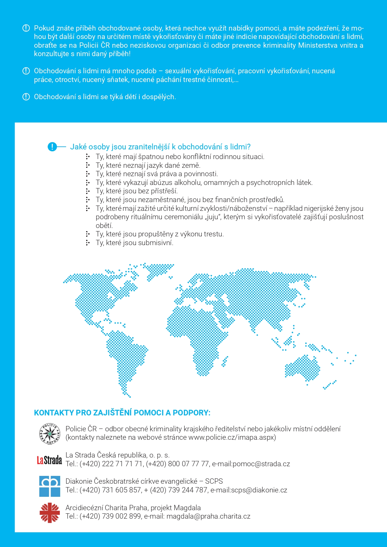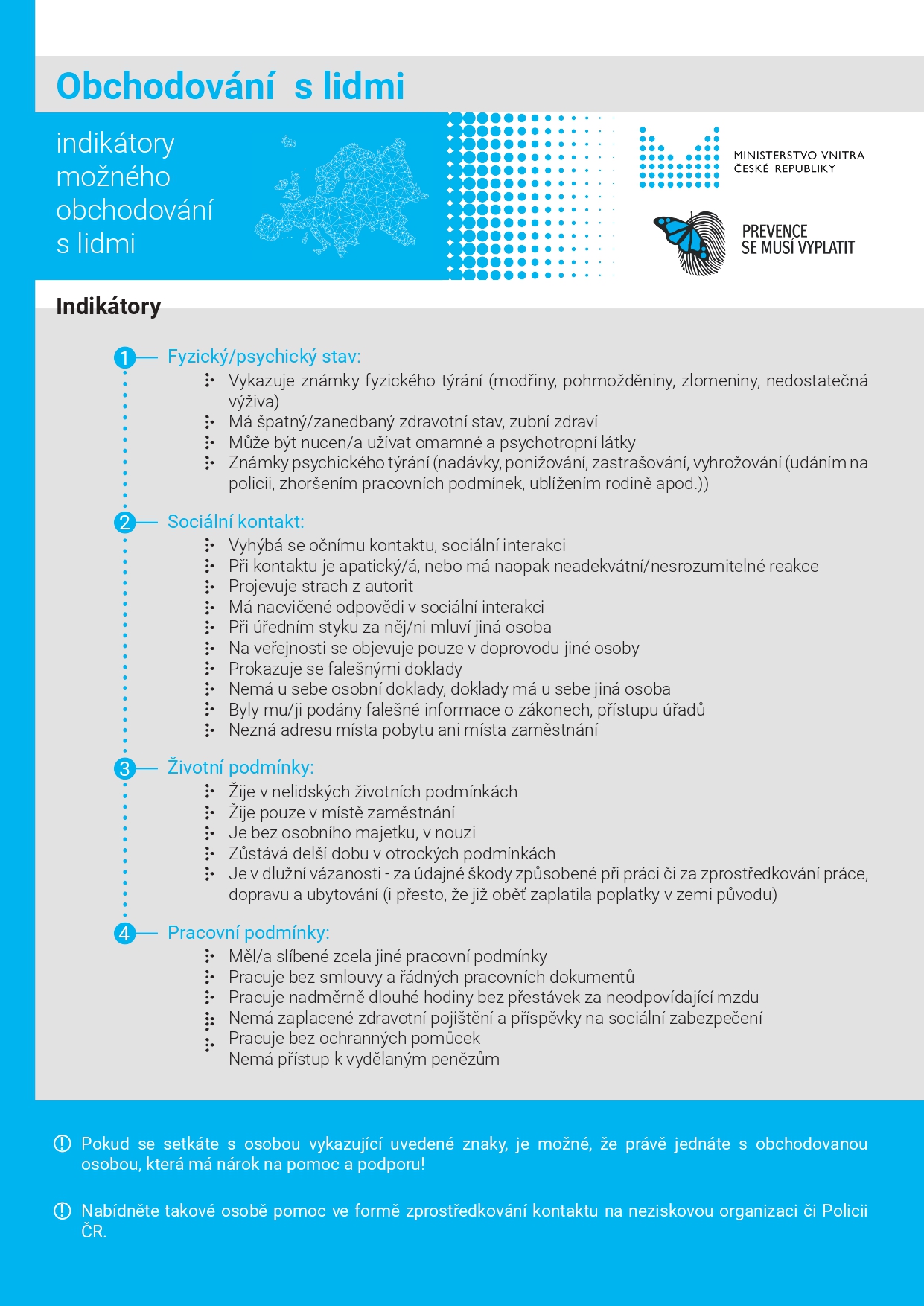 Účastníkům setkání byly rovněž předány informační karty s indikátory, které pomáhají identifikovat možné oběti obchodování s lidmi. Tyto karty hodnotí fyzický a psychický stav, sociální kontakt, životní a pracovní podmínky obětí. Karty zároveň obsahují kontakty na pomocné a podpůrné organizace, které jsou k dispozici pro osoby v nouzi.