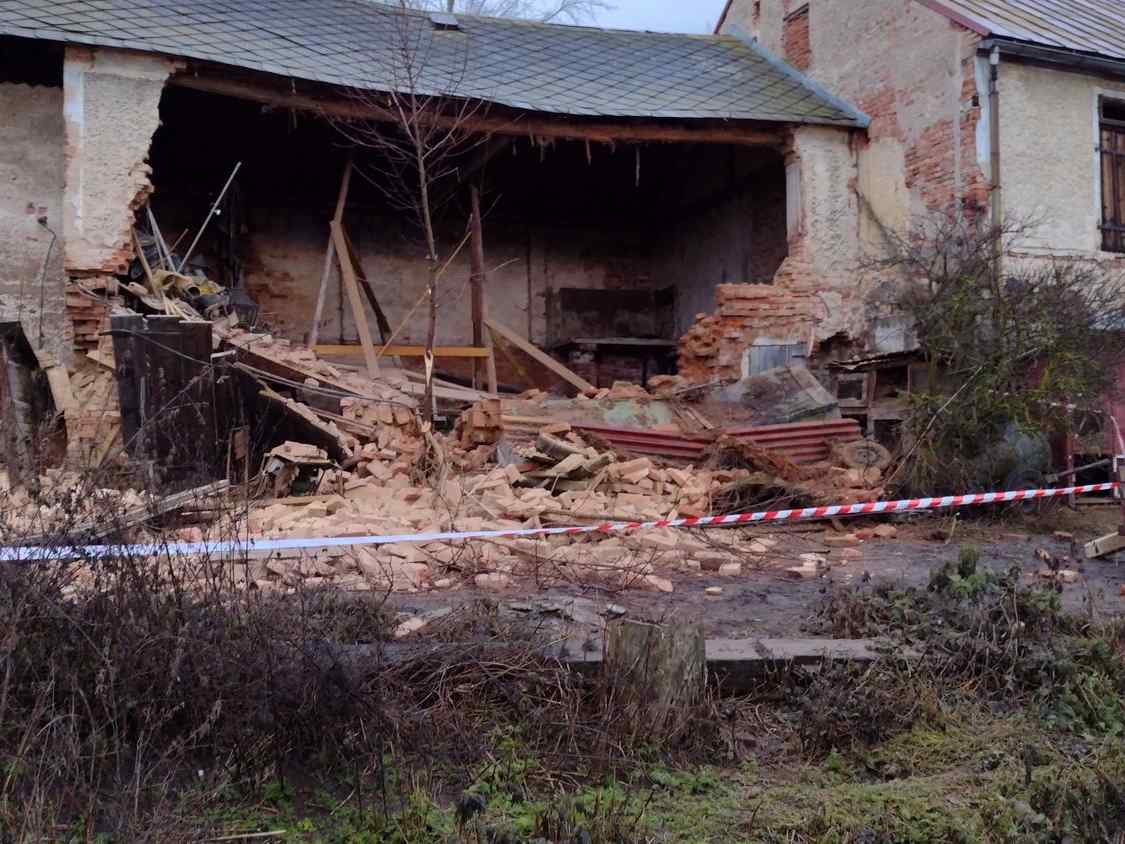 Těšenice - Boční stěna hospodářského stavení spadla v pondělí v ranních hodinách. V době zřícení byla u stěny jedna osoba, kterou zasáhla část sutin. Událost se stala v obci Těšetice u Bochova.