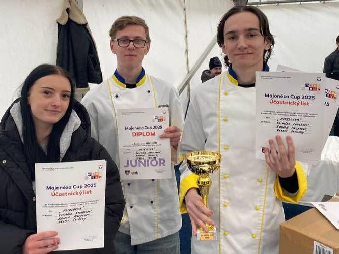 Mariánské Lázně - Dne 29. 11. 2025 se ve sportovním areálu v Mratíně ve Středočeském kraji uskutečnil Majonéza Cup – Mistrovství České republiky v přípravě bramborového salátu. V kategorii JUNIOR reprezentovali Hotelovou školu Mariánské Lázně žáci oboru kuchař/kuchařka ve složení Karolína Kociánová, Eduard Neubauer a Václav Skružný. Soutěžili pod odborným dohledem učitele odborného výcviku pana Kubíka.