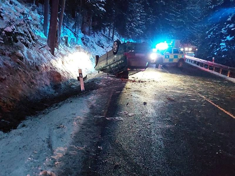 Druhá nehoda pak blokovala provoz na silnici mezi Dolními Nivami a Jindřichovicemi. Jedno osobní auto zde skončilo na střeše.