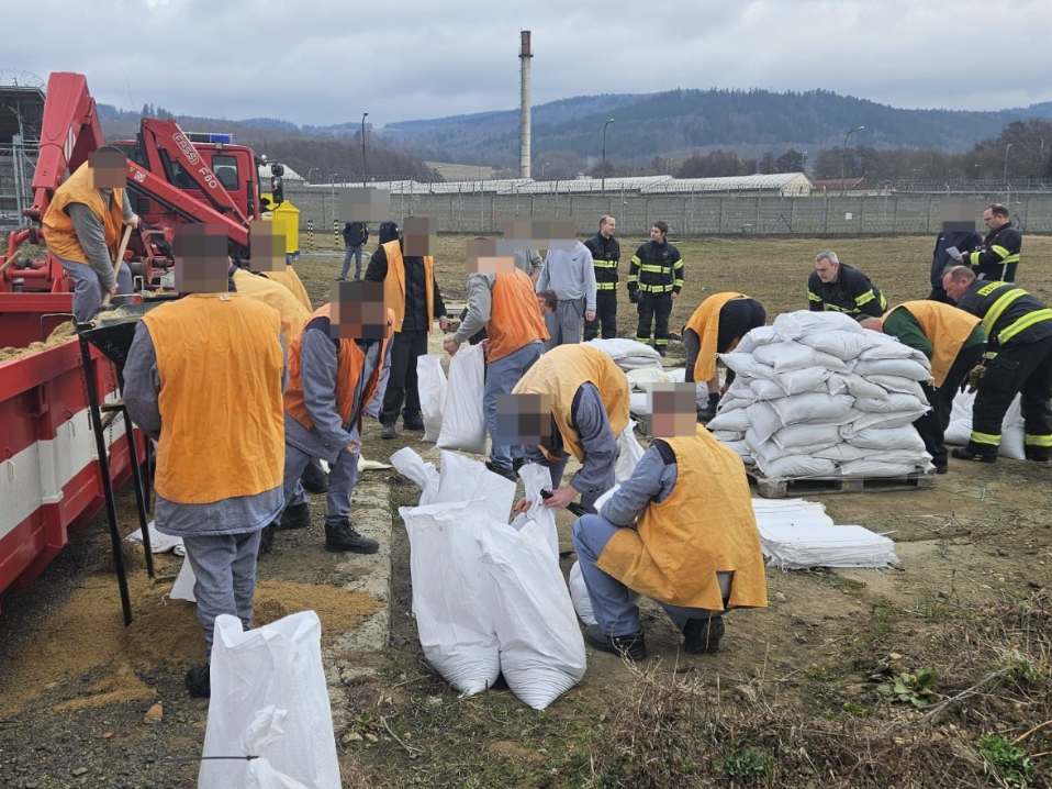 Karlovarský kraj - Hasiči HZS Karlovarského kraje ze stanice Ostrov absolvovali ve Věznici Vykmanov taktické cvičení zaměřené na plnění pytlů s pískem a budování protipovodňových opatření.